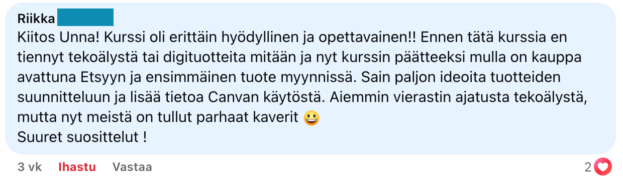 💡 Aava Digituoteideageneraattori (tekoälyapuri) – auttaa sinua löytämään oman digituoteideasi, kirkastamaan unelma-asiakkaasi ja rakentamaan tuotteesi rungon.