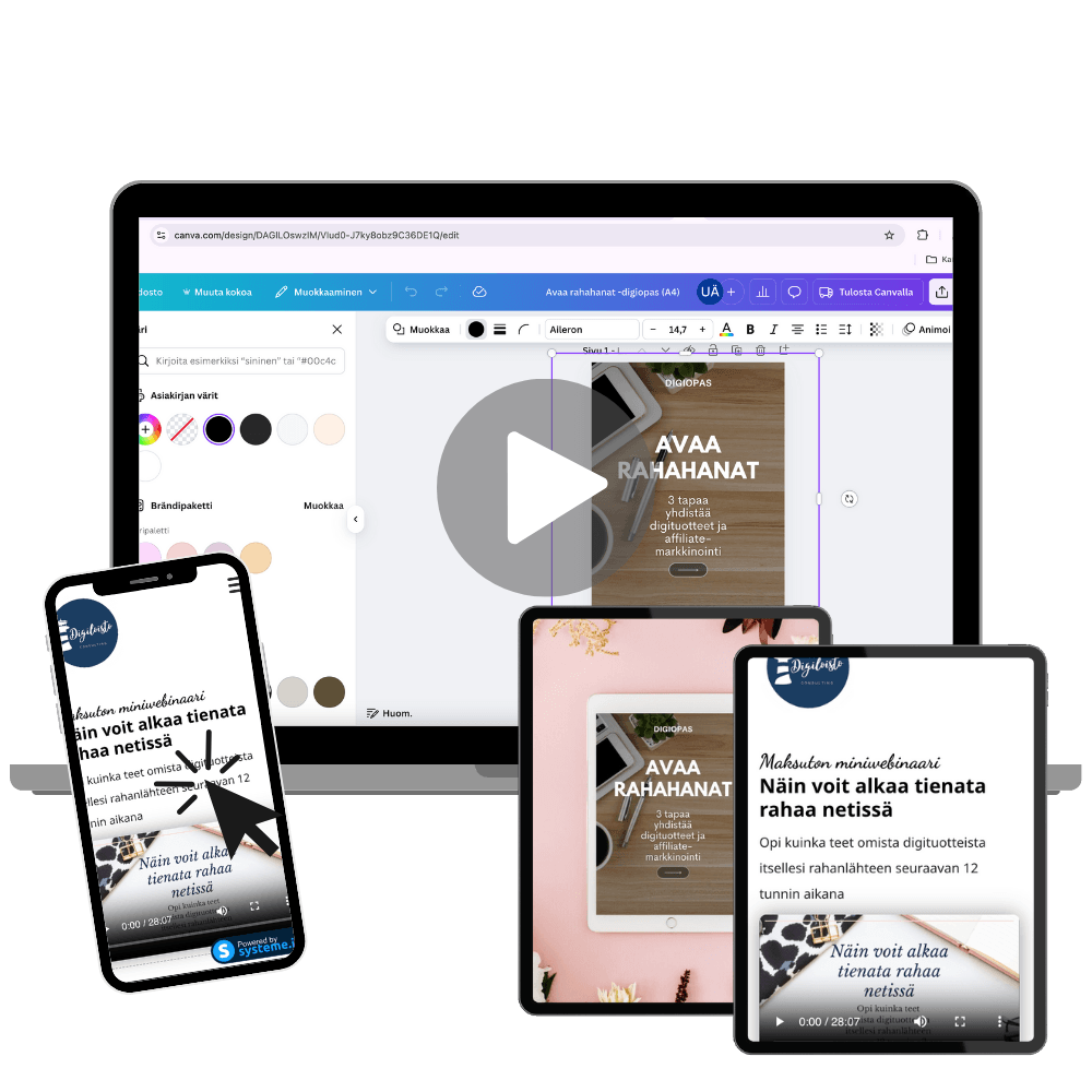 Kyllä pystyt. Tämä kurssi on tehty erityisesti kaltaisillesi – heille, jotka eivät halua uhrata tunteja säätämiseen, googlailuun ja pähkimiseen. Käytössäsi on selkeät video-ohjeet, valmiit mallit, sekä työkalut kuten Canva, Systeme.io ja ChatGPT, jotka tekevät raskaan työn puolestasi. Sinun tehtäväsi on klikkailla, kirjoittaa komentoja, hioa tekstejä ja seurata ohjeita.