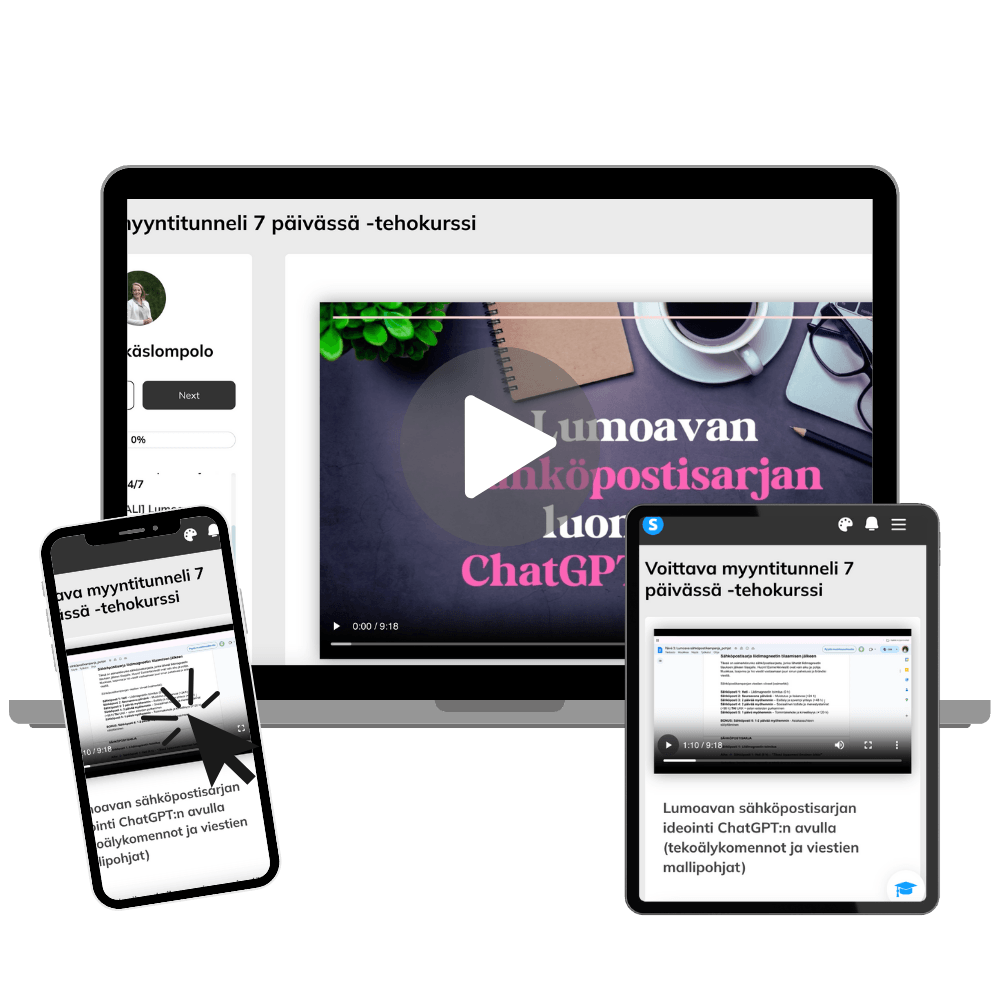Ei hätää! Kurssilla opit askel askeleelta tekoälyn (mm. ChatGPT) käyttöä, miten tehokkaita komentoja tehdään ja miten voit tekoälyn kanssa sparrailla ideoita ja sisältöjä omaan myyntitunneliisi. Tiesithän, että tekoälyn kanssa voi keskustella ihan suomeksi.