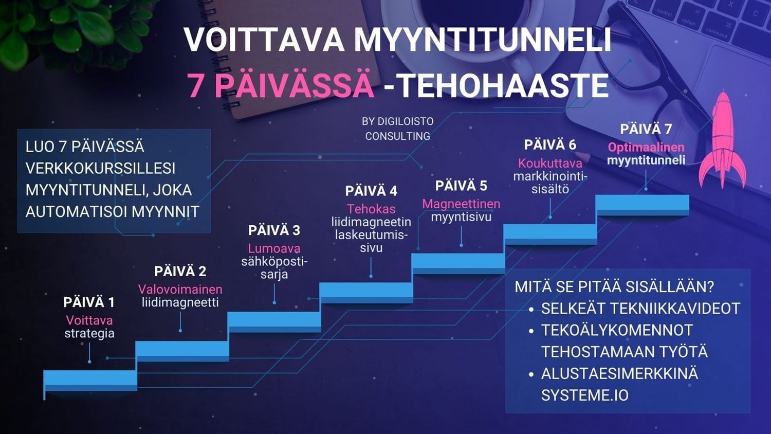 Voittava myyntitunneli 7 päivässä tehohaasteen jälkeen sinulla on pystyssä automaattinen myyntikoneisto, joka alkaa tuottaa sinulle tasaisempaa kurssimyyntiä.